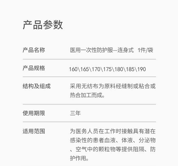 【使用方法】展开防护服,拉开拉链,从拉链开口处依次伸入双腿,再穿着上衣,手从衣袖中伸出,带好头套,从胸前正面拉好拉链即可