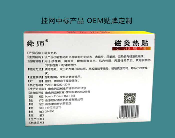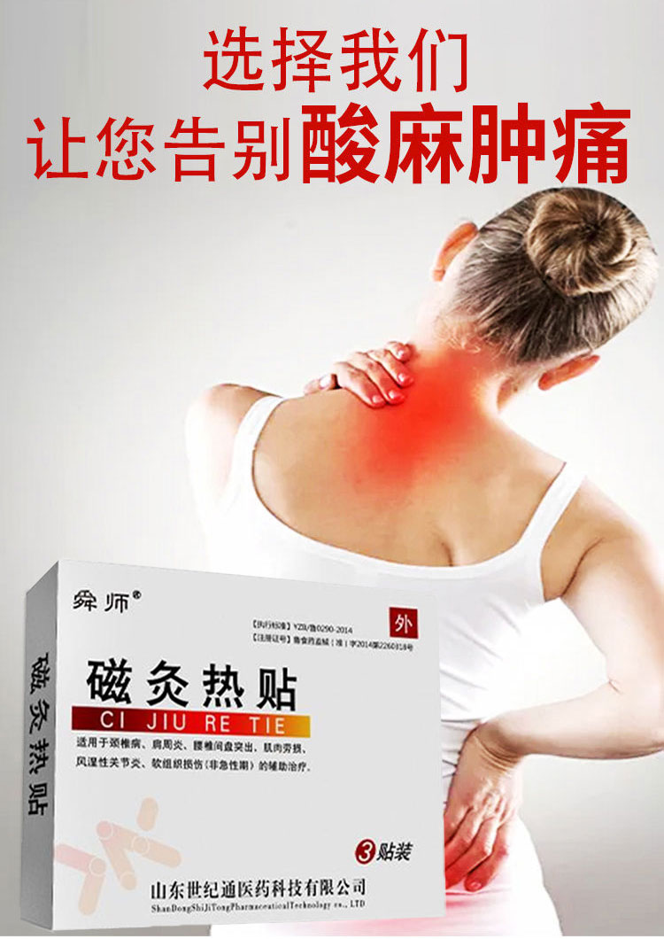 磁灸热贴作用是风湿性关节炎、颈椎病、腰椎间盘突出、骨质增生、肩周炎、腰肌劳损、急性扭挫伤、老寒腿、老寒腰等汉磁灸热贴,是山东世纪通药业有限公司由多位中医专家,在继承中国两千年之久的中医精髓传统灸法的理论基础上,融合现代科技的中医药理学、人体工学、物理化学等技术研制而成的产品。