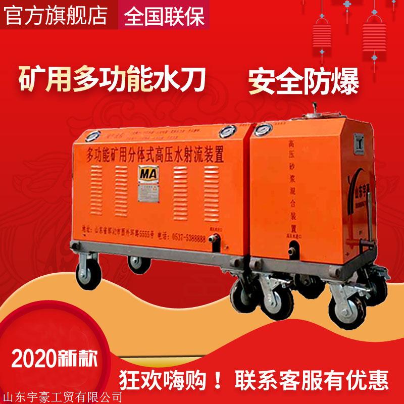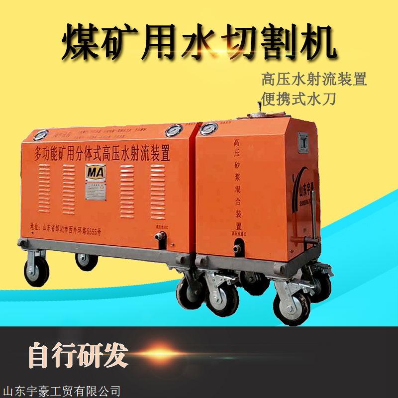 山东宇豪工贸有限公司自主研发的新型产品QSM-4.5-15-BG煤矿井下便携式水切割机,可切割厚度在0~100mm内的任何材质(玻璃钢、金刚石及特种硬质合金除外),取得矿用产品安全标志认证,符合煤矿安全生产要求,可以在煤矿井下任何有水、电地点进行切割作业,切割枪体可延伸100米至狭窄或缺水、电环境进行切割作业。解决了煤矿井下高瓦斯易燃易爆环境设备拆除、维修过程中及紧急抢险的切割作业。同时解决化工企业罐体拆除或维修切割作业过程中易燃易爆问题。工作原理是:工作介质通过低压软管经储水罐过滤后流入高压泵,煤矿井下用隔爆型三相异步电动机为高压柱塞泵提供动力,将工作介质加压,高压水流经高压软管进入磨料罐,与磨料充分混合,并带动磨料加速,后通过切割枪,形成高压磨料射流,进行切割作业。