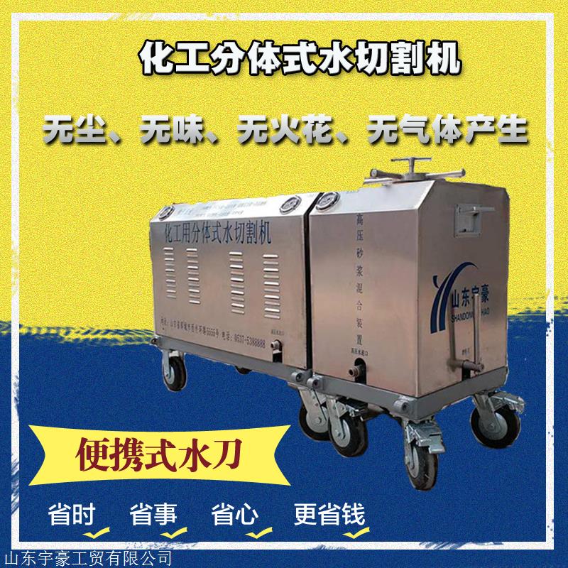 山东宇豪工贸有限公司自主研发的新型产品QSM-4.5-15-BG煤矿井下便携式水切割机,可切割厚度在0~100mm内的任何材质(玻璃钢、金刚石及特种硬质合金除外),取得矿用产品安全标志认证,符合煤矿安全生产要求,可以在煤矿井下任何有水、电地点进行切割作业,切割枪体可延伸100米至狭窄或缺水、电环境进行切割作业。解决了煤矿井下高瓦斯易燃易爆环境设备拆除、维修过程中及紧急抢险的切割作业。同时解决化工企业罐体拆除或维修切割作业过程中易燃易爆问题。工作原理是:工作介质通过低压软管经储水罐过滤后流入高压泵,煤矿井下用隔爆型三相异步电动机为高压柱塞泵提供动力,将工作介质加压,高压水流经高压软管进入磨料罐,与磨料充分混合,并带动磨料加速,后通过切割枪,形成高压磨料射流,进行切割作业。
