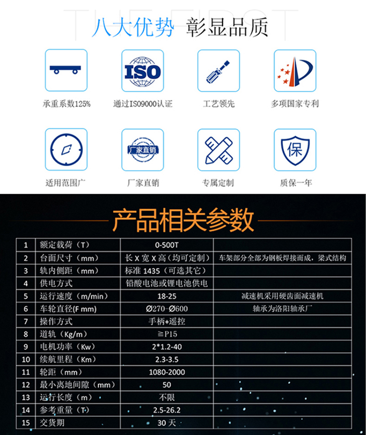 电动平车不需带燃料即可行驶的特性是任何燃料汽车所不具备的。这一特性不仅适用于厂内,同样也适用于短途运输,主要特点如下: 1、环保节能,运行成本低。 2、投资少,回报率高。 3、性能高,具有高科技可持续发展的巨大潜能。