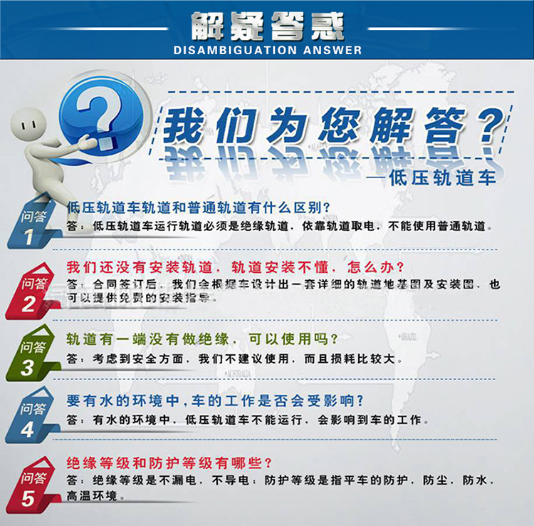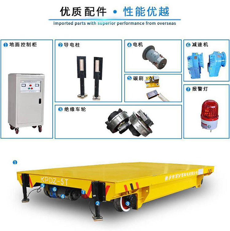 低压供电的平板车通常采用轨道滑触线供电。360V低压轨道供电电动平车,分为36v单相供电、三相供电。低压电动平车安全可靠,容易实现瑶控和自动化,很耐砸,不会妨碍交叉运输,也方便了厂区的运输布置。但是低压电动平板车对轨道施工方面的要求是比较高的,一定要保证轨道绝缘。低压电动平车的行走轨道又兼做馈电轨,因此平板车轨道之间的要求是车体和车轮之间要保证绝缘,而且铺设轨道的时候要做特殊的绝缘处理。