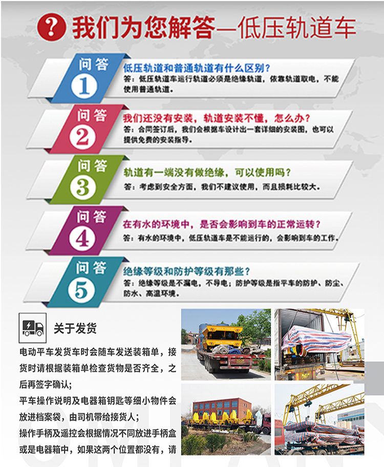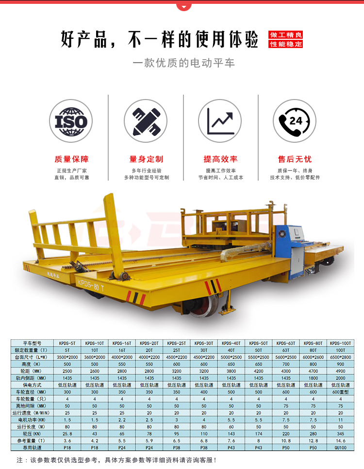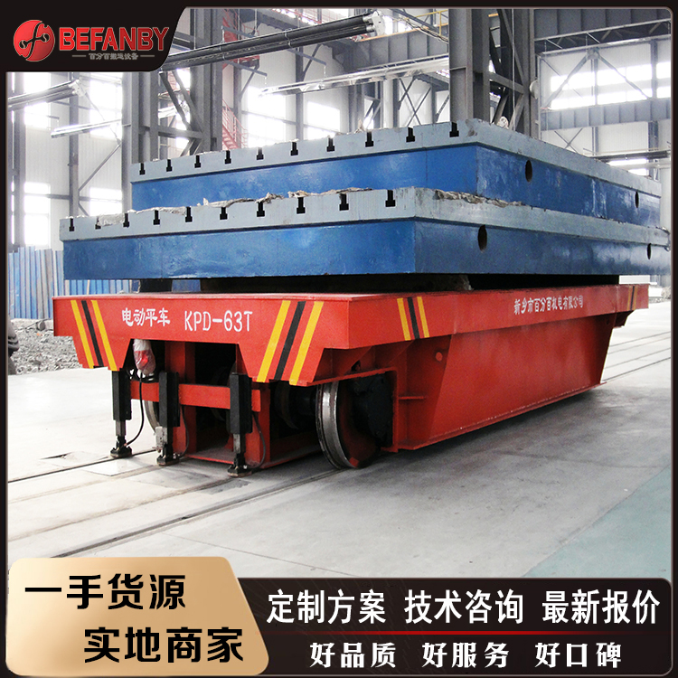 KPD系列低压轨道供电式轨道平车的原理是通过将普通电压降为36伏安全电压然后连接到轨道,通过轨道供电给平车电机。由于采用36V安全电压,安全性能高;轨道平车由于不用电缆车外不用布线,故不怕烫,不怕砸,不妨碍交叉运输,凭借这些其它平车无可比拟的优点成为轨道电动平车行业的重要产品。但低压轨道供电型轨道平车轨道安装成本较较高高,轨道施工要求严格,须保证轨道绝缘,超过一定的运行距离时轨道应加铜排补偿线,运行距离较长时还必须增加降压变压器个数,且轨道平车防雨水性较差不适宜在露天场所使用。