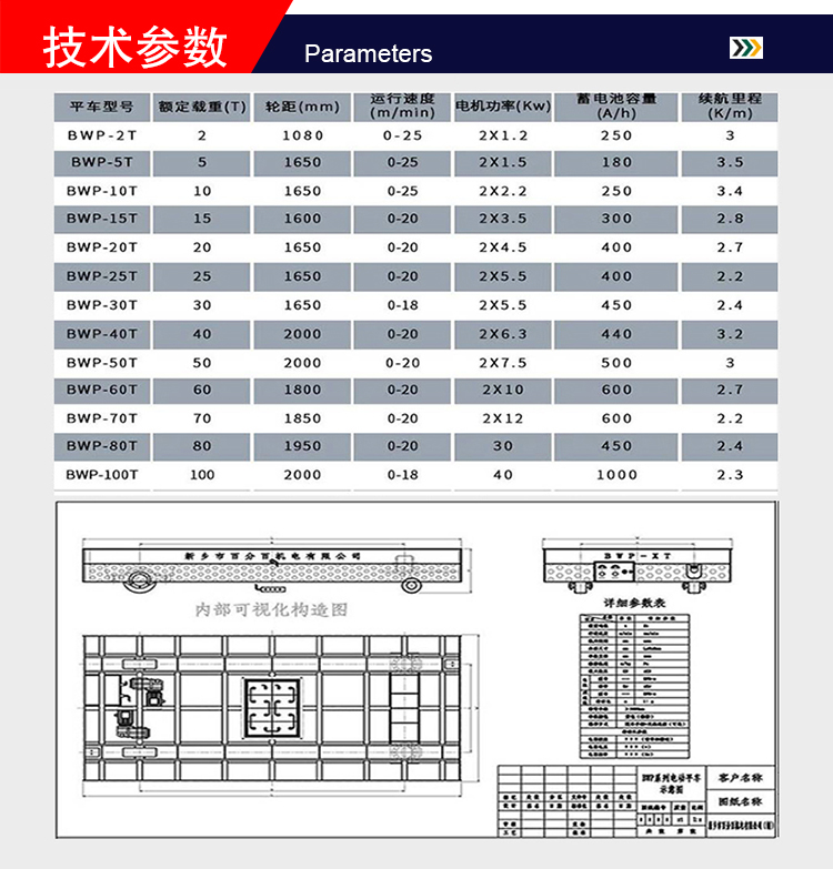 1、BWP电动平板台车是一种可以在地面自由转弯的蓄电池搬运设备,平车是由安装与平车内部的蓄电池供电,由直流控制系统控制驱动装置使平车前进、转弯、停止、后退。