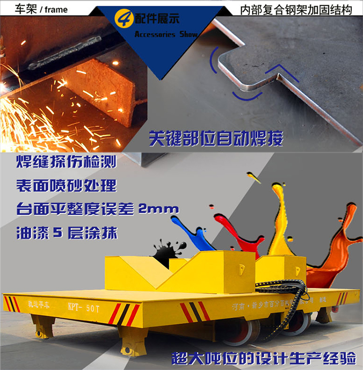 1、KPT电动平车结构简单,台面设计可以非常低,可以用于喷砂房转运输工件,电动平车四周设置围板,可以有效保护电机、减速机等零部件