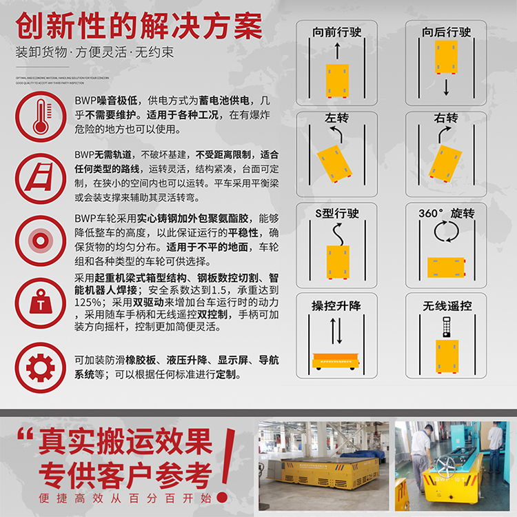 3、BWP无轨平车可以室外环境使用,平车采用聚氨酯包胶轮,因此不需要铺设轨道,可以在平整的混凝土或钢板地面使用。