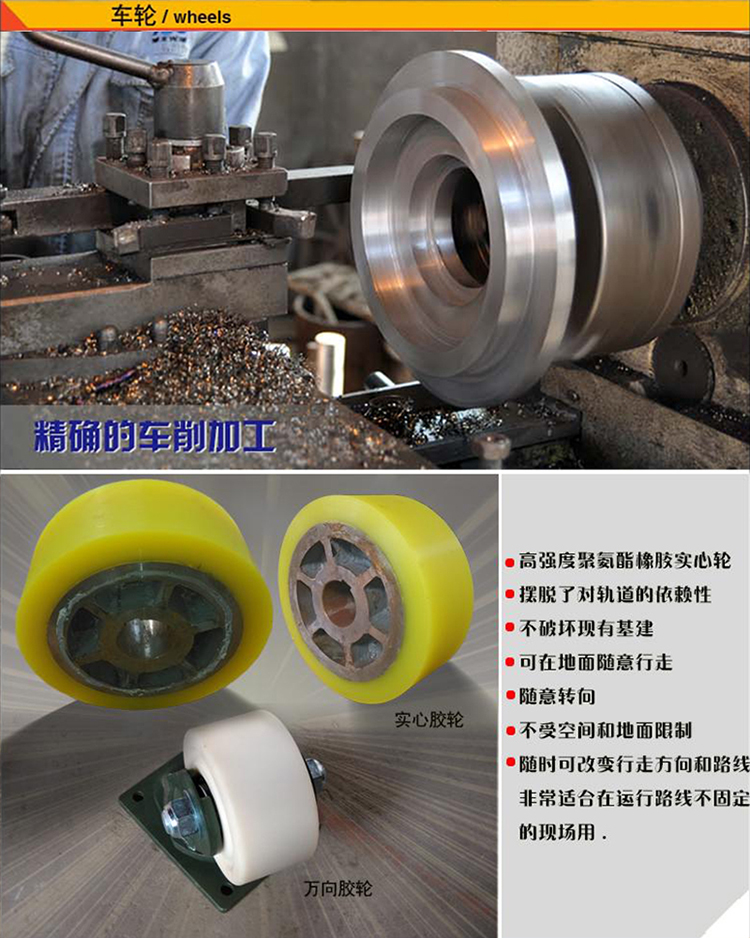 5、BWP蓄电池无轨电动车采用聚氨酯包胶轮,是一种可以在混凝土地面和钢板地面使用,平车可以360度自由转弯。