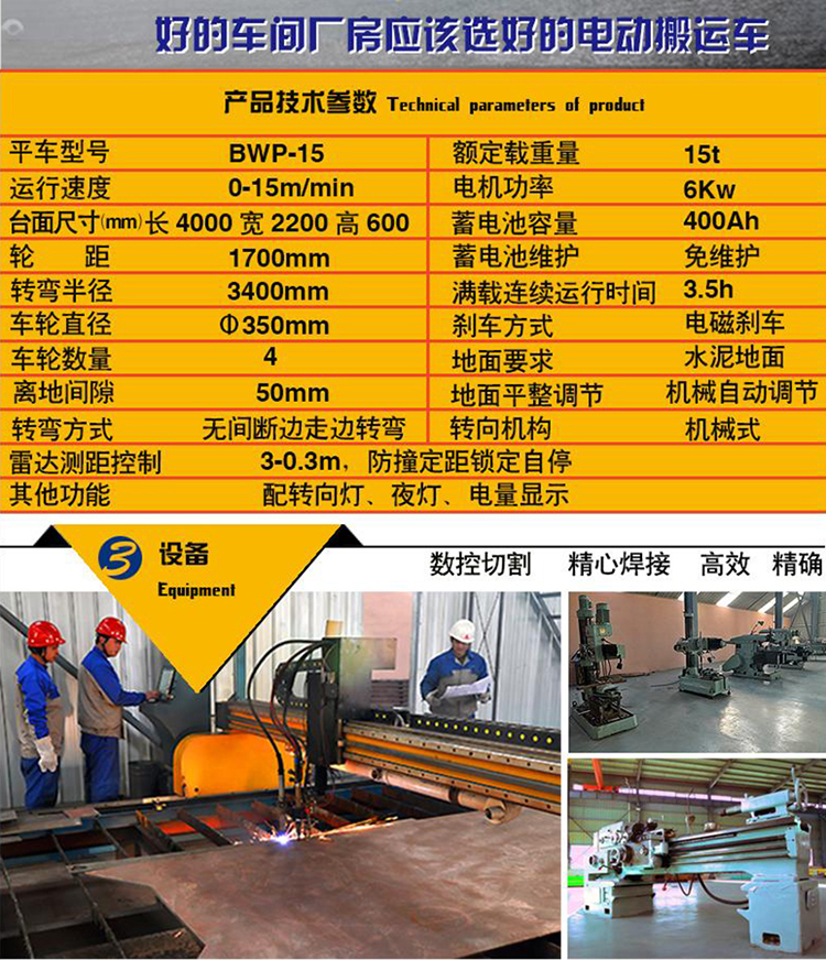 3、BWP无轨电动平车承载能力强,多用于转运输机械车间机床车床,多种型号不用种类的车窗分转运输转换工位等。