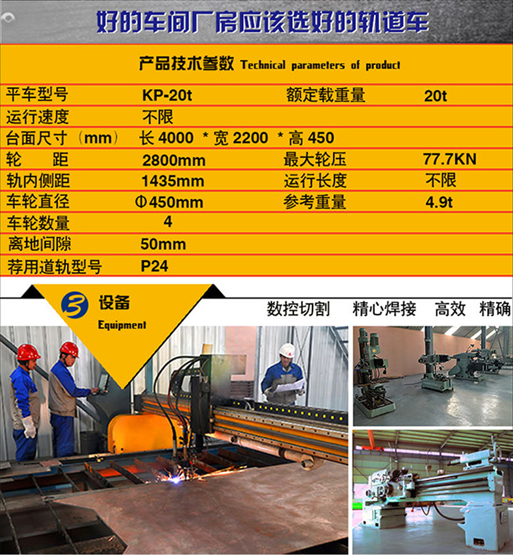 KP系列无动力平板车就是用于重物运输专用的无动力平板车,该系列低压轨道供电电动平车适应恶劣工矿的起重冶金用,平车结构简单可靠、价格经济、检修方便、轨道施工方便,是一套传统的轨道平板车选用方案。拖车平板车可以通过操作人员在平滑或者半平滑地面被推拉。不需要叉车牵引就很容易操作。 这类平板车是通用的, 而且可以为您的实际施用而量身定制。