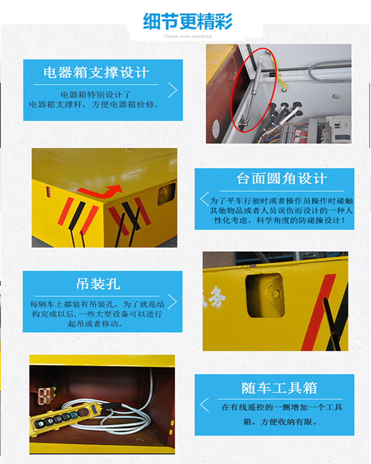2、转弯轨道平车优势:转弯电动轨道平车与直线运行电动平车的差别就在于轮子结构。因其需要转弯,轮子不可以直接固定在车架上面,需要以回转支承连接车轮和车架。承重轮两边需加装辅助轮,辅助轮为双轮缘,防止转弯电动平车在转弯的时候脱轨。转弯电动平车看似简单的结构改变,其技术含量,制造难度比普通电动平车大很多。