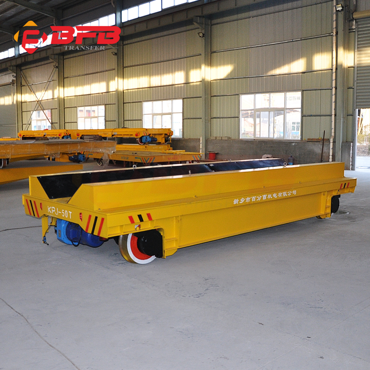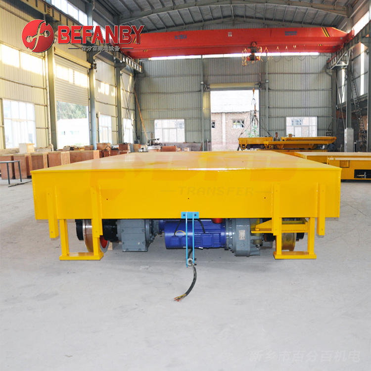 电动平板车结构简单,设计成本较低,性价比较高,可以作为转运输工具配合厂内吊车行车转运输工件物料等。在转运输各种灌装时,电动平车台面上可加装滚轮支架或V型架以稳定灌装物料,运行距离不受限制,超过50米时可加装排线器来辅助电缆卷筒收放电缆线。