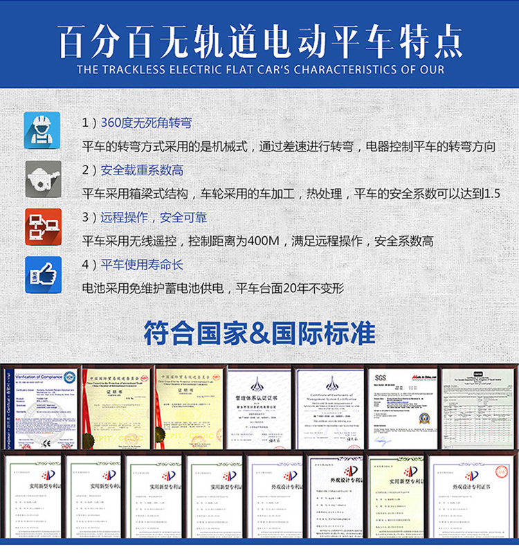 1、电动无轨平车箱梁型结构,载重系数较高,承重能力强,不易变形。
