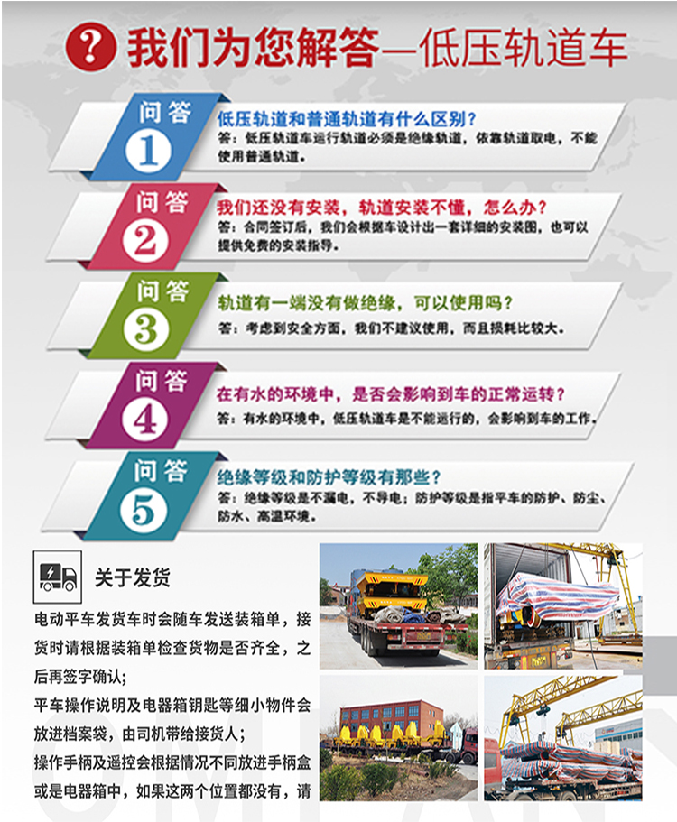 3、KPDZ低压轨道电动平车对轨道要求较高,需要对轨道进行绝缘处理,因此不适合室外有积水的场合。