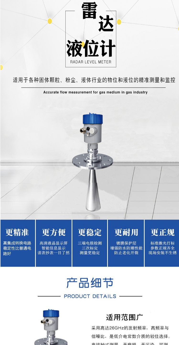 智能高频雷达液位计 喇叭口26G导波物位计 化工防爆煤仓防腐料位计适用于液体/固体物料作物位高度显示、报警、控制和远传显示或 组成系统,并有高/低限报警和 4~20mA 变送输出。