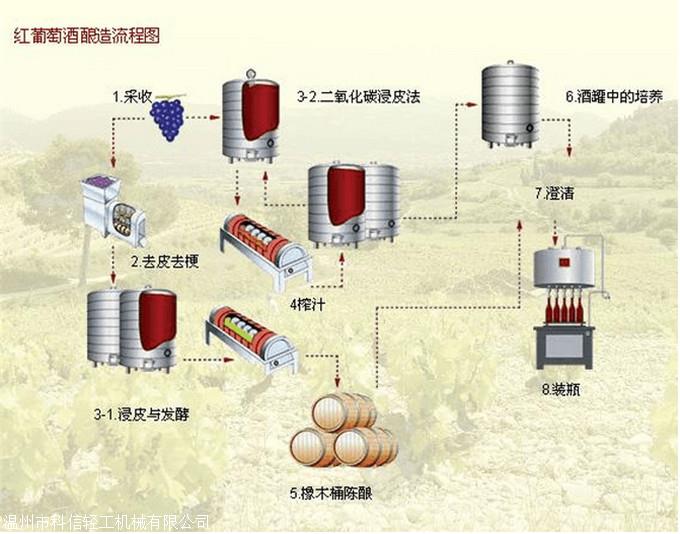 原料选择→分选→去梗→破碎→消毒→前发酵→压榨→调整酒度→后发酵→贮藏→沉清→过滤→装瓶.灭菌。