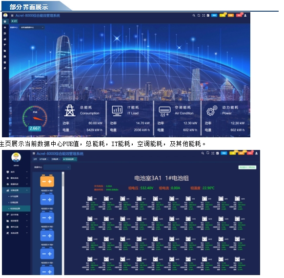 监测机柜或者UPS电源的电压、电流、功率、功率因数、谐波含量、频率、负荷率设备用电量、电能利用效率等。