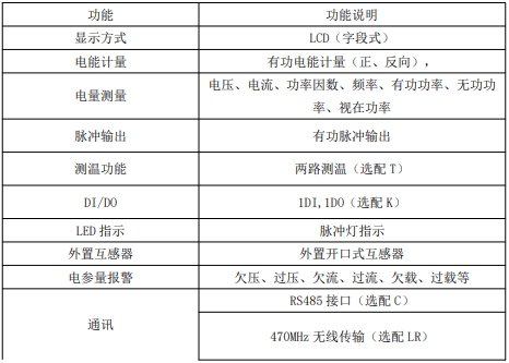 基本功能:主要用于计量低压网络的有功电能,能计量当前组合有功电能,以及正向、反向有功电能,还可计量感性无功电能、容性无功电能和视在电能。同时,能测量全电力参数,包括电压、电流、有功功率、无功功率、视在功率、功率因数、电压与电流的相角度、频率等。