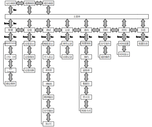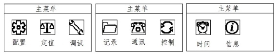 装置菜单为多级菜单,在任一幅主界面里按“确定”键即进入主菜单,主菜单分为 8个子菜单,如图 3.5,由子菜单名称、图标构成。选定任一子菜单后按“确认”键进入菜单,按“返回”键返回上级菜单。图 3.6 为快速导航示意图,可以依据该图迅速查找相关参数。