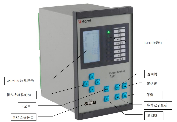 装置的人机交互主要在面板上进行,包括四个部分:液晶显示、LED 灯指示、按键和RS232(DB9)维护口。液晶显示屏采用 256*160 点阵,可以显示测量电流、电压、功率等电参量实时值,遥信量,事件记录,装置参数,定值参数,时间,装置版本号信息等。LED 灯用来指示装置的运行状态、保护动作等信息,具体指示内容可根据用户需要进行任意配置,