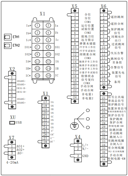 电气接线图如图所示,包括交流输入量接线、开入开出接线、控制回路接线、通讯接线和辅助电源接线等。X1 端子为交流输入量端子,Ia、Ib、Ic 为保护相电流,IA、IB、IC 为测量相电流,I01、I02 为两路零序电流接入。UA、UB、UC 为三路电压接入,U0 为外接零序电压接入。U'、U''为备用输入。