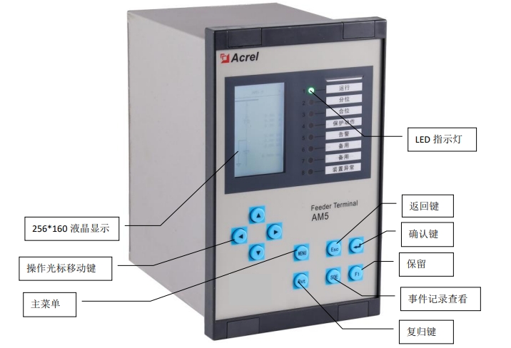 装置的人机交互主要在面板上进行,包括四个部分:液晶显示、LED 灯指示和按键。液晶显示屏采用 256*160 点阵,可以显示测量电流、电压、功率等电参量实时值,遥信量,事件记录,装置参数,定值参数,时间,装置版本号信息等。LED 灯用来指示装置的运行状态、保护动作等信息,具体指示内容可根据用户需要进行任意配置,图 3.1