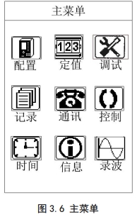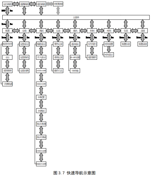 装置菜单为多级菜单,在任一幅主界面里按“主菜单”键或者“确认”键即进入主菜单,主菜单分为 8 个子菜单,如图 3.6,由子菜单名称、图标构成。选定任一子菜单后按“确认”键进入菜单,按“返回”键返回上级菜单。图 3.7 为装置的快速导航示意图,可以依据该图迅速查找相关参数