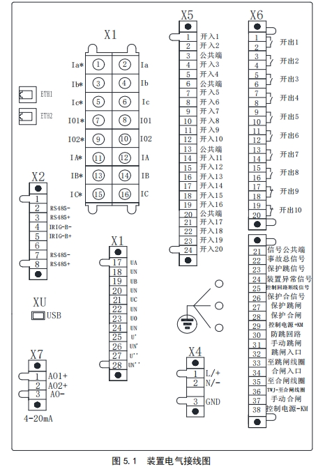 X7.1、X7.3 为路 4-20mA 输出,默认定义为保护电流 A 相二次值;X7.2、X7.3 为第二路 4-20mA 输出,默认定义为母线电压 A 相二次值。XB1、XB2 为以太网通讯端子,支持 TCP IEC60870-5-103、TCP Modbus-RTU 规约。该端子为选配,若需要需在订货前说明。XU 为 USB 维护口。