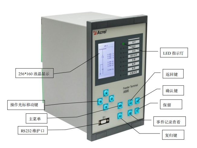装置的人机交互主要在面板上进行,包括四个部分:液晶显示、LED 灯指示、按键和RS232(DB9)维护口。液晶显示屏采用 256*160 点阵,可以显示测量电流、电压、功率等电参量实时值,遥信量,事件记录,装置参数,定值参数,时间,装置版本号信息等。LED 灯用来指示装置的运行状态、保护动作等信息,具体指示内容可根据用户需要进行任意配置,图 3.1 中为出厂默认配置。