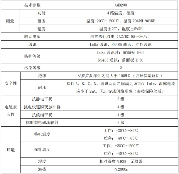 AMB200 系列母线接头测温装置是一种针对绝缘母线槽连接器温度在线监控的装置。该产品可对母线槽内母排温度进行实时监控、高温预警及报警,预警值及报警值均可设置,且装置可选 RS485 或无线传输功能,可将采集到的母线温度及其变化状况等数据实时传送到监控系统。装置主要应用于各种领域的密集绝缘母线连接器的在线温度监控系统。