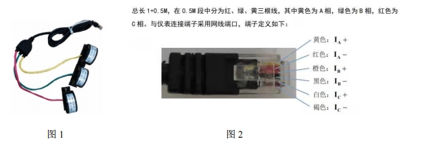 电流互感器为水晶头接口,一次侧电流为 50A-600A,若电流互感器不同,客户可根据实际使用情况,通过仪表界面或通讯修改电流变比。互感器如图 1、图 2 所示。
