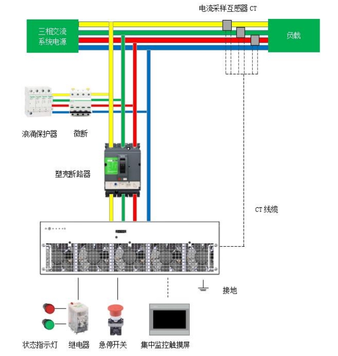 ANSVG静止无功发生器是一种用于补偿无功、谐波治理以及不平衡调节的新型电力电子装置;智能控制系统主动根据系统的线性动态需求,自动调节模块的输出;ANSVG整机主要是由ANSVG模块组成;能完成更大容量的无功功率的补偿,整机通过一个7寸触摸屏实现人机交互。触摸屏通过RS485与ANSVG模块进行通信。
