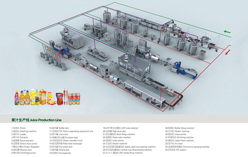 这条生产线用于生产果汁饮料。根据客户要求和产量,生产线可定做2000/36000瓶/小时生产线。整个生产线包括水果预处理系统、水处理系统、配糖系统、除气均匀灭菌系统、CIP清洗系统、吹瓶机系统、瓶装机系统、送风机、灌装机、二次灭菌系统、打标机、烘干机、喷墨打印机、涂膜机、运输设备、锅炉等。自动化程度可根据客户要求配置,提供工艺流程和车间布局设计,并在整个生产过程中提供技术指导。