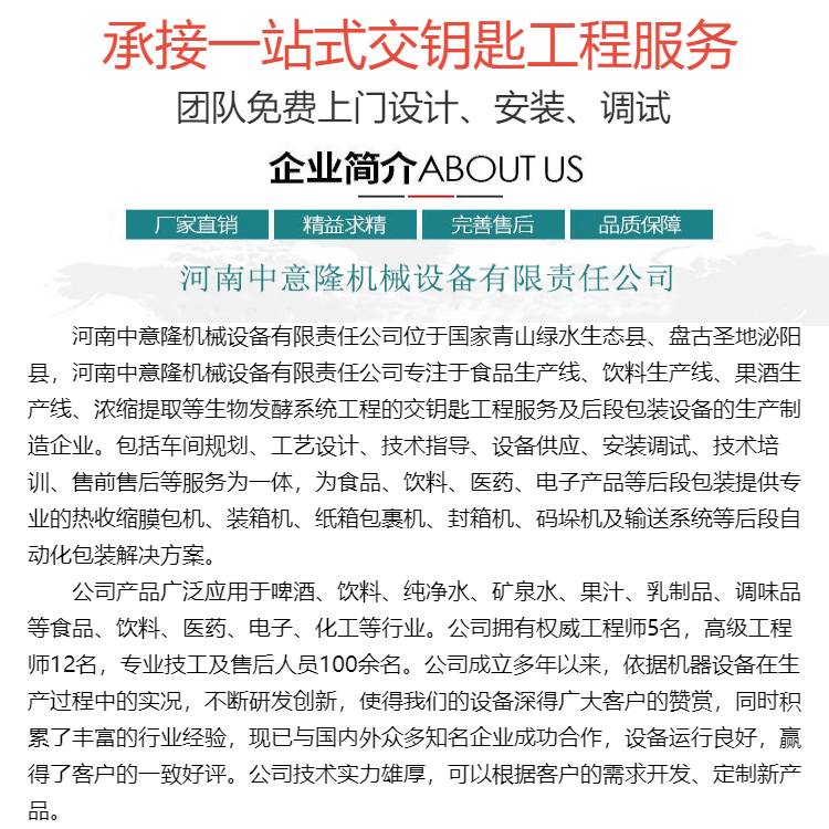 河南中意隆机械设备有限公司提供各种成套果汁饮料生产线、碳酸饮料生产线、纯净水生产线、矿泉水生产线、萄酒生产线、桶装水生产线、果酒生产线、各种酒类灌装线、食用油灌装线、牛奶灌装铝箔封口机、瓶装酸奶灌装机、乳品生产机械,饮料生产机械设备,饮料生产线等等。本公司经过十多年的不懈努力,发展壮大,公司将继续以科技为核心,吸收国内外先进的技术和经验,不断积极创新,与国际标准接轨,为广泛的客户提供所需的工艺、设备以及服务。公司代表性各类生产线工程:各种饮料生产线、各种饮料包装成套设备、果醋生产线、葡豆奶生产线等系统生产线。欢迎广大新老客户利用好当地的资源优势,如水果、草本植物、高蛋白类、菌类等等资源,都可以做成饮料生产线。