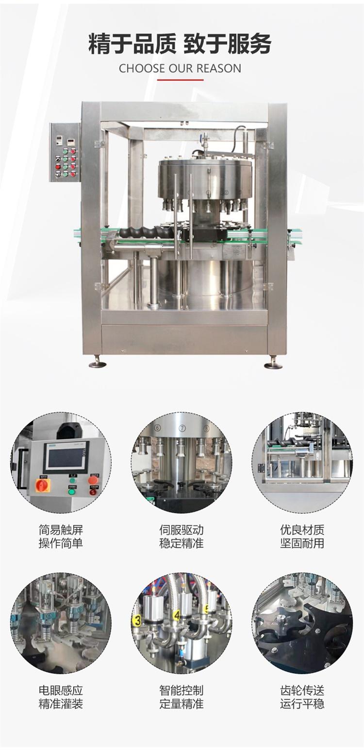 进入水灌装设备的瓶子由瓶颈托板卡住并在凸轮作用下将瓶子上升,然后由瓶口将灌装阀顶开。灌装采用重力灌装方式。灌装阀打开后物料通过灌装阀完成灌装过程,灌装结束后瓶口下降离开灌装阀,瓶子通过卡瓶颈过渡拨轮进入旋盖机。旋盖机上的止旋刀卡住瓶颈部位,保持瓶子直立并防止旋转。旋盖头在旋盖机上保持公转并自转,在凸轮作用下实现抓盖、套盖、旋盖、脱盖动作,完成整个封盖过程。成品瓶通过出瓶拨轮从旋盖机传送到出瓶输送链上,由输送链传送出纯净水三合一灌装机。