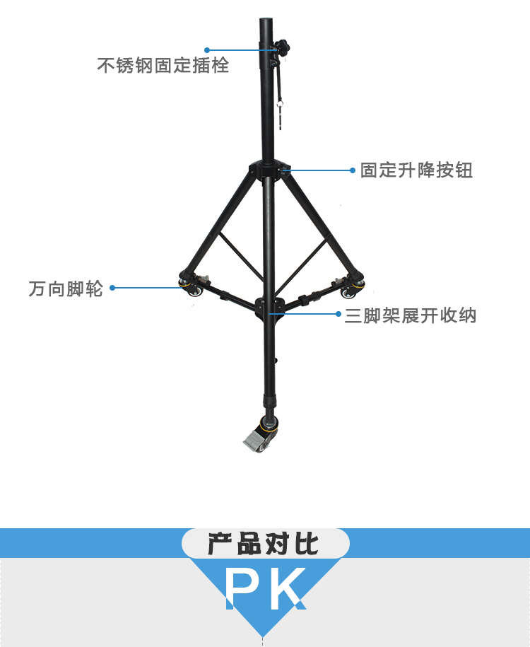 三脚架:分体式轻钢机架,升降可调,支架的高度可在1~1.7米之间调节;