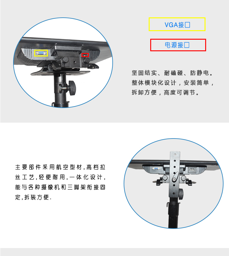 轻便稳固:航空型材滑道,轻便耐用,一体化设计,能与各种摄像机和三脚架固定使用,拆装简便.