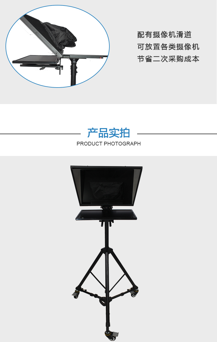 配置清单:提词器主体结构及相关螺丝,摄像机滑道,小型相机增高架,分光镜,遮光罩,19寸文稿屏,独立式三脚架,万向脚轮,提词器软件,10米VGA线.
