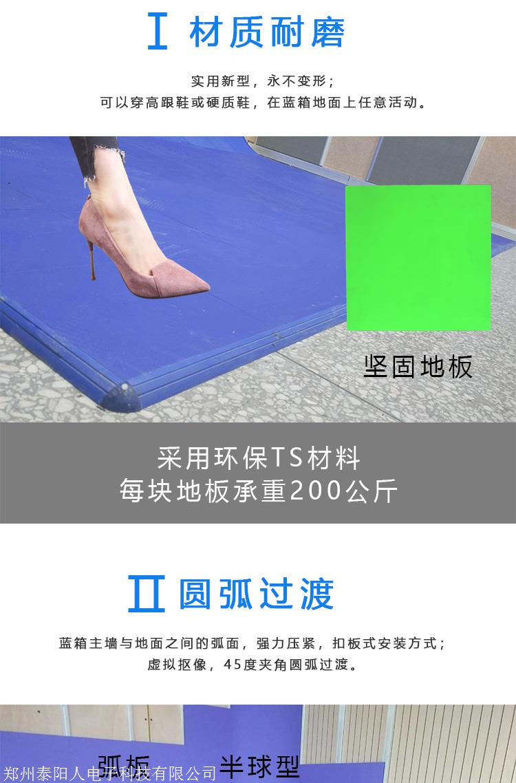 模块化、拼接式、虚拟蓝箱设计无需刷漆,可反复利用,便于施工,本方案涉及了多个模块化产品,蓝箱部分分为墙板、弧形板、球形板、地板,铝合金底支架,均为数控磨具产品,一次成型,尺寸标准,颜色一致,无批次差;地板设计防水、强度高,耐磨,不变色;