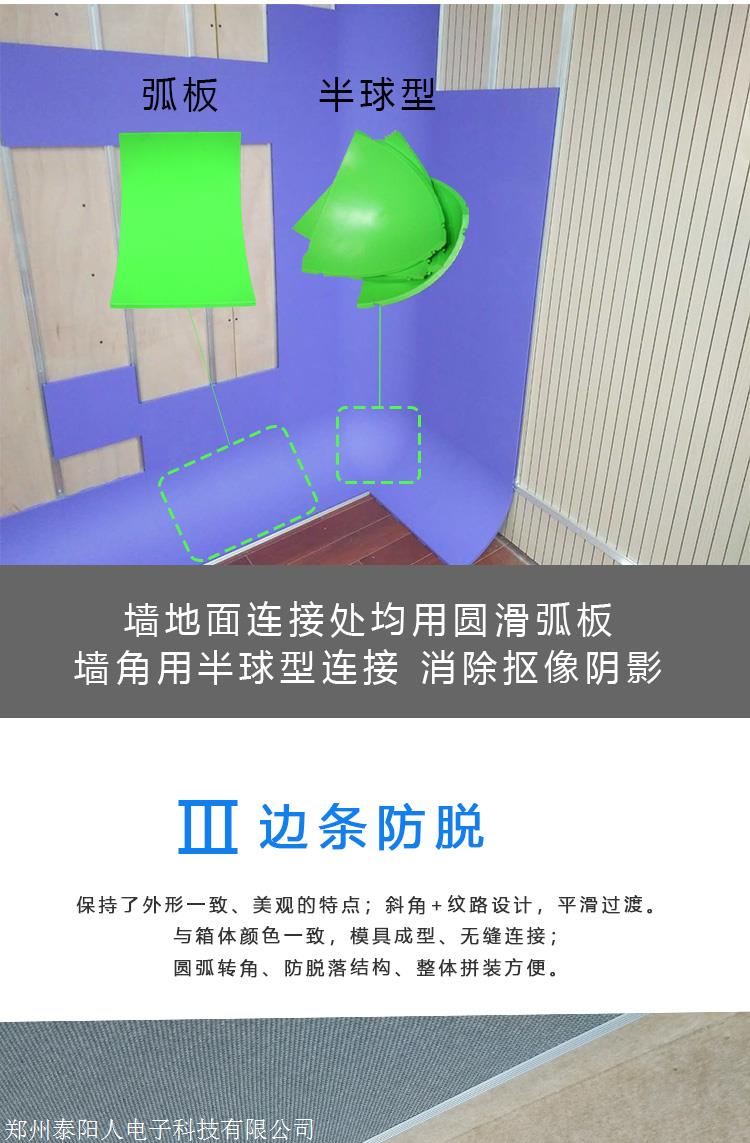 模块化、拼接式、虚拟蓝箱设计无需刷漆,可反复利用,便于施工,本方案涉及了多个模块化产品,蓝箱部分分为墙板、弧形板、球形板、地板,铝合金底支架,均为数控磨具产品,一次成型,尺寸标准,颜色一致,无批次差;地板设计防水、强度高,耐磨,不变色;