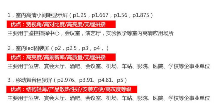 适用性强,色彩丰富:由三基色(红、绿、蓝)显示单元箱体组成,红、绿、蓝256级灰度构成16777216种颜色,使电子屏实现显示色彩丰富、高饱和度、高解析度、显示频率高的动态图像;适用范围:广场、休闲广场、繁华商贸中心、广告信息发布牌、商业街、火车站、体育场馆等。