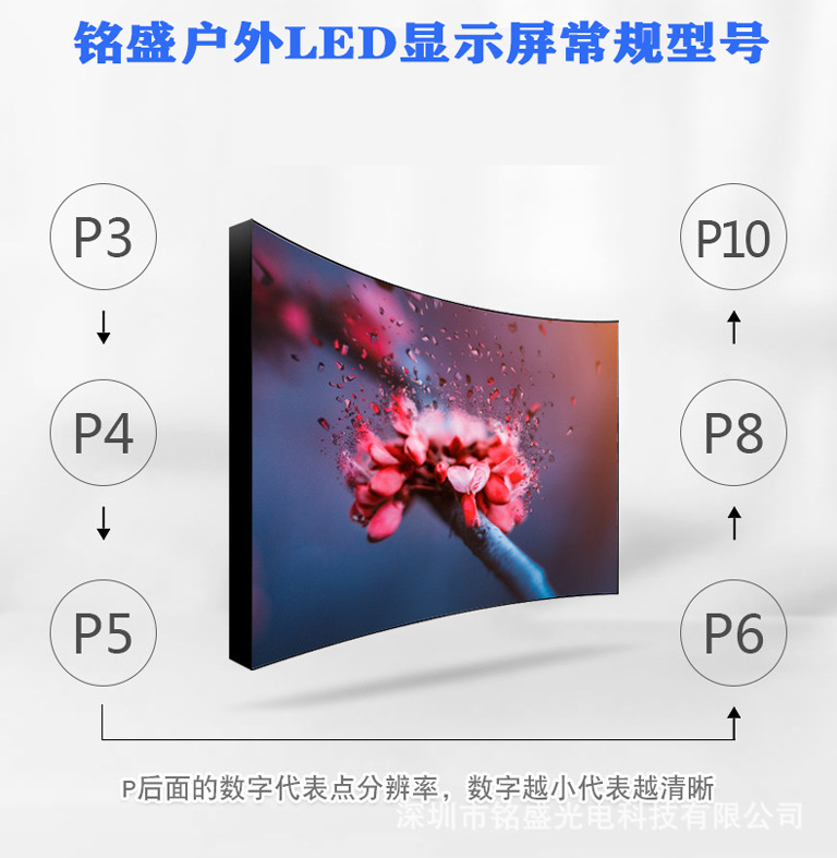 深圳市铭盛光电科技有限公司是从事LED显示屏研发、生产、销售为一体的解决方案全球供应商。公司主营产品有LED显示屏租赁系列、户内外广告屏系列、高清小间距系列、体育球场屏系列、交通诱导屏系列以及异形屏等LED显示屏产品。