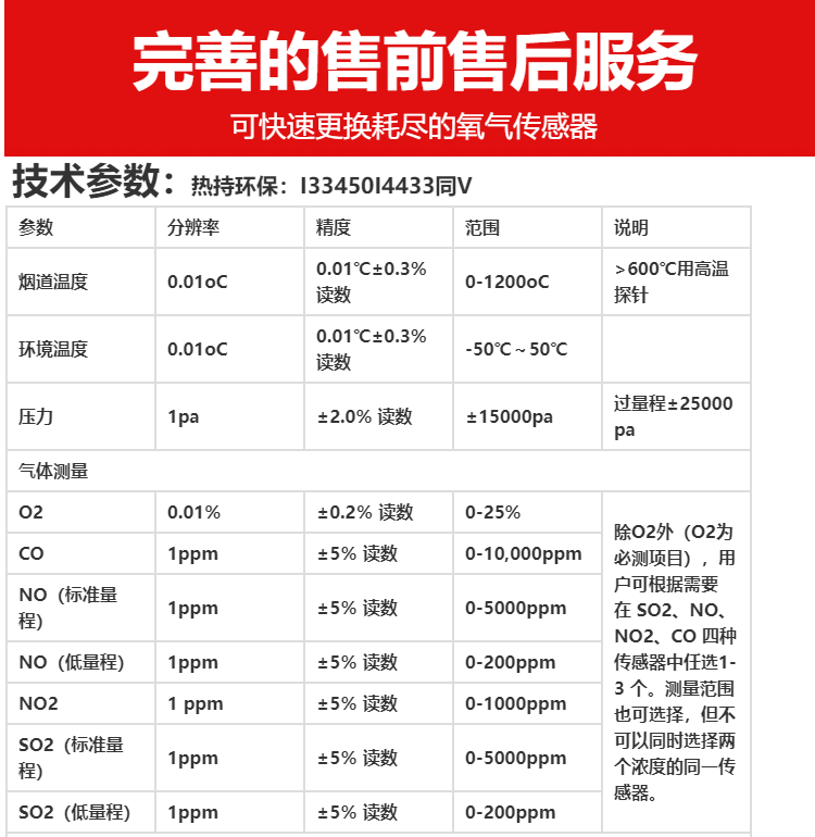 可以测量 O2、SO2、NO、NO2、CO、烟气温度、环境温度、烟道压力、总效率、