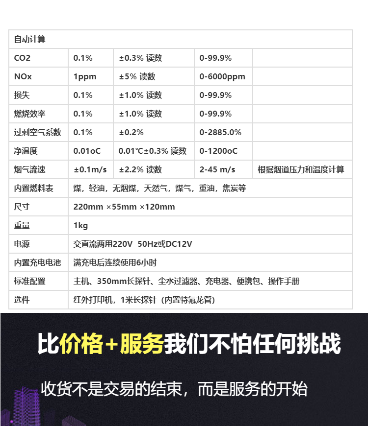 自动计算烟气流速、CO2、NOx、净效率、总损失、净损失、过剩空气系数