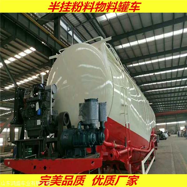 粉粒物料运输半挂车是针对大批量粉尘物料(散装水泥)运输的专用车辆,一般适用于严格按照国家规定执行计重收费的区域,容积一般在35-45方之间。适用于粉煤灰、水泥、石灰粉、双仓粉料物料罐车 来源厂家制定的渠道 矿石粉等颗粒直径不大于0.1mm粉粒干燥物料的运输和气压卸料,卸料垂直高度达到15m时,水平还可输送距离达5m。半挂粉粒物料运输车是利用自备发动机动力通过取力器驱动车载空压机,将压缩空气通过管道送入密封罐体下部的气室,使流化床上的水泥悬浮成流态状,当罐内压力达到额定值时,打开卸料蝶阀,流态化水泥通过管道流动而进行输送。采用国内先进工艺制作,设计新颖,坚固耐用。气袋式承载量大,卸料速度快残留量小。一体合成的罐体具有整体强度高、刚性好、承压好、使用性能好等特点。罐内流化床设计科学, 布置合理, 能有效的缩短卸料时间, 达到1.4t/min,提高了罐体的容积利用率,降低了剩灰率,剩灰率为0.2%。粉粒物料运输车罐体采用双锥内倾卧式结构,双管进气、双筒加料,其卸料速度和剩余率均符合行业标准要求。
