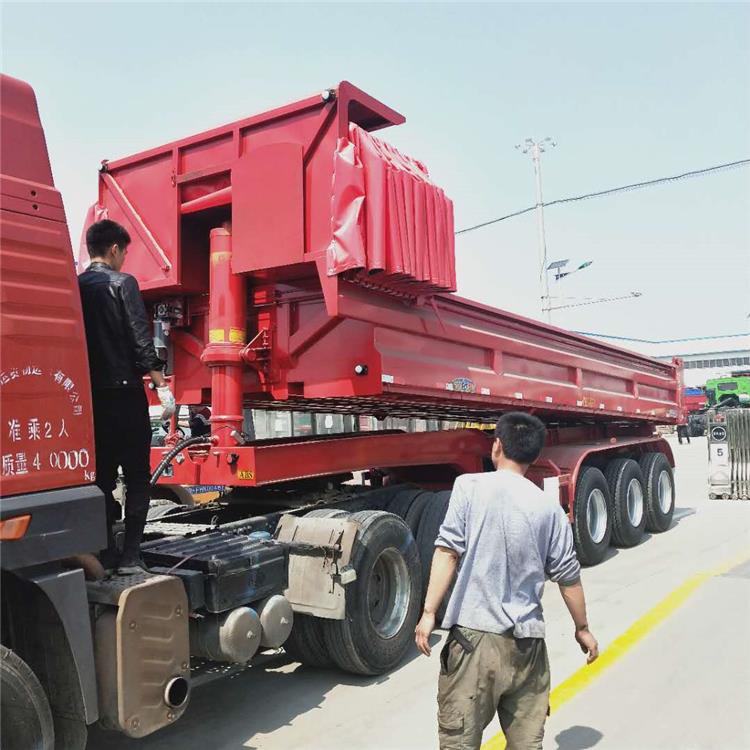 后翻是本公司新开发的一种新型半挂自卸车。它具有重心低,举升不易翻车等特点。车架与车厢已获 得专利,车架用16锰梁板制成,大大增加了承载强度。重心降低至1.3米一1.4米,运货中不上晃不 易侧翻,对轮胎和板簧、车架损害降低许多。 车厢采用前窄后宽的模式,根据三角形原理,当车厢举起时其重心比较集中,其边角线的倾斜到一 定角度时,大箱的边角钱与地面垂直,其底平线两边相差10公分,即大箱也不会侧翻。大箱的前窄后竟 设计更有利于货物的自卸,不易发生阻塞,货物均匀下滑,不至于发生一面下,一面不下的情况,因而 不会使车发生侧翻。 车的油缸是从厂家订做的,其材质强度与普通油缸不同,保修三年。