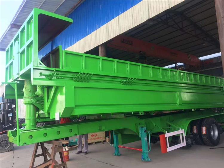 后翻是本公司新开发的一种新型半挂自卸车。它具有重心低,举升不易翻车等特点。车架与车厢已获 得专利,车架用16锰梁板制成,大大增加了承载强度。重心降低至1.3米一1.4米,运货中不上晃不 易侧翻,对轮胎和板簧、车架损害降低许多。 车厢采用前窄后宽的模式,根据三角形原理,当车厢举起时其重心比较集中,其边角线的倾斜到一 定角度时,大箱的边角钱与地面垂直,其底平线两边相差10公分,即大箱也不会侧翻。大箱的前窄后竟 设计更有利于货物的自卸,不易发生阻塞,货物均匀下滑,不至于发生一面下,一面不下的情况,因而 不会使车发生侧翻。 车的油缸是从厂家订做的,其材质强度与普通油缸不同,保修三年。