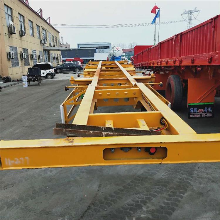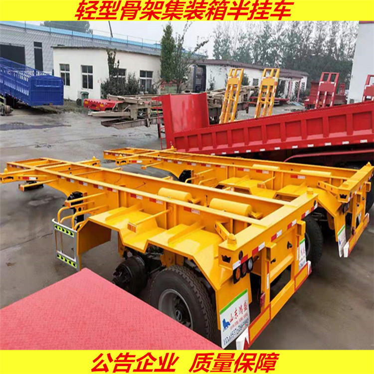 系列集装箱运输半挂车的车架全部喷丸处理,整个车架是在专用的定位台架上组装、焊接而成,其结构合理、强度高、外形美观。在车架上设置了集装箱紧缩装置,可以装载40英尺、20英尺两种标准集装箱。前后端的四个集装箱紧缩装置为固定式结构,中间集装箱紧缩装置为可藏式结构。骨架式车驾由纵梁、横梁和前、后端梁焊接而成,纵梁采用优质钢板16Mn埋弧焊接成工字形(主要尺寸有450、500),横梁采用优质钢板冲压成槽型,前后端梁为焊接式矩形截面。中间集装箱锁紧装置部位设置了整体式长横梁,以提高集装箱锁紧装置的承载能力。集装箱骨架车重量是6.1吨左右,用的是高强度板材,采用特殊的焊接技术。优点本公司的车辆轴距小,后悬大,减轻了中间受力,抗载能力强。使用高强度钢材,先进的技术,精确的设计,造出新以代轻型半挂车;