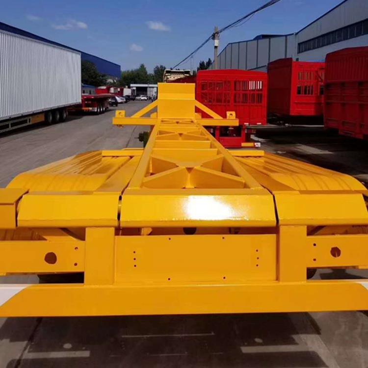 系列集装箱运输半挂车的车架全部喷丸处理,整个车架是在专用的定位台架上组装、焊接而成,其结构合理、强度高、外形美观。在车架上设置了集装箱紧缩装置,可以装载40英尺、20英尺两种标准集装箱。前后端的四个集装箱紧缩装置为固定式结构,中间集装箱紧缩装置为可藏式结构。骨架式车驾由纵梁、横梁和前、后端梁焊接而成,纵梁采用优质钢板16Mn埋弧焊接成工字形(主要尺寸有450、500),横梁采用优质钢板冲压成槽型,前后端梁为焊接式矩形截面。中间集装箱锁紧装置部位设置了整体式长横梁,以提高集装箱锁紧装置的承载能力。集装箱骨架车重量是6.1吨左右,用的是高强度板材,采用特殊的焊接技术。优点本公司的车辆轴距小,后悬大,减轻了中间受力,抗载能力强。使用高强度钢材,先进的技术,精确的设计,造出新以代轻型半挂车;