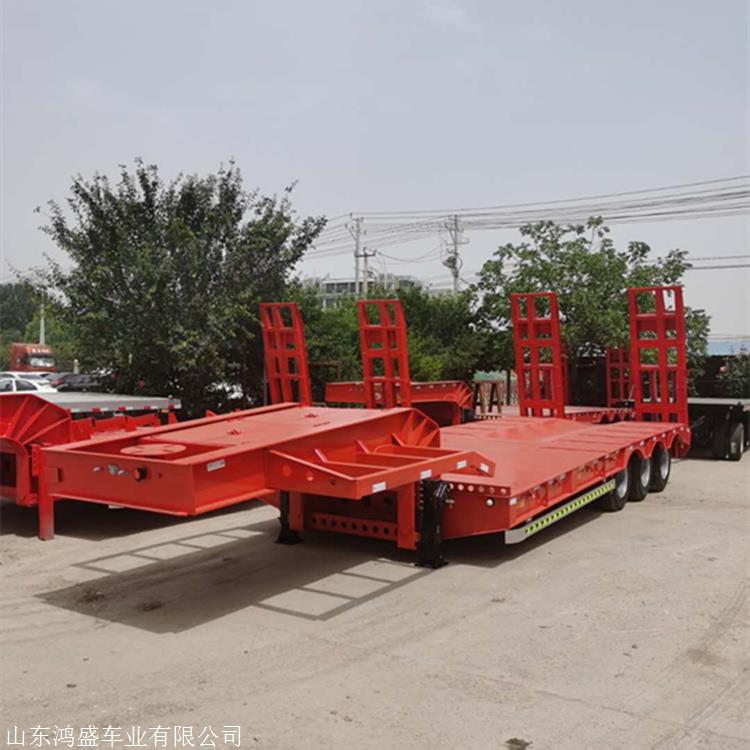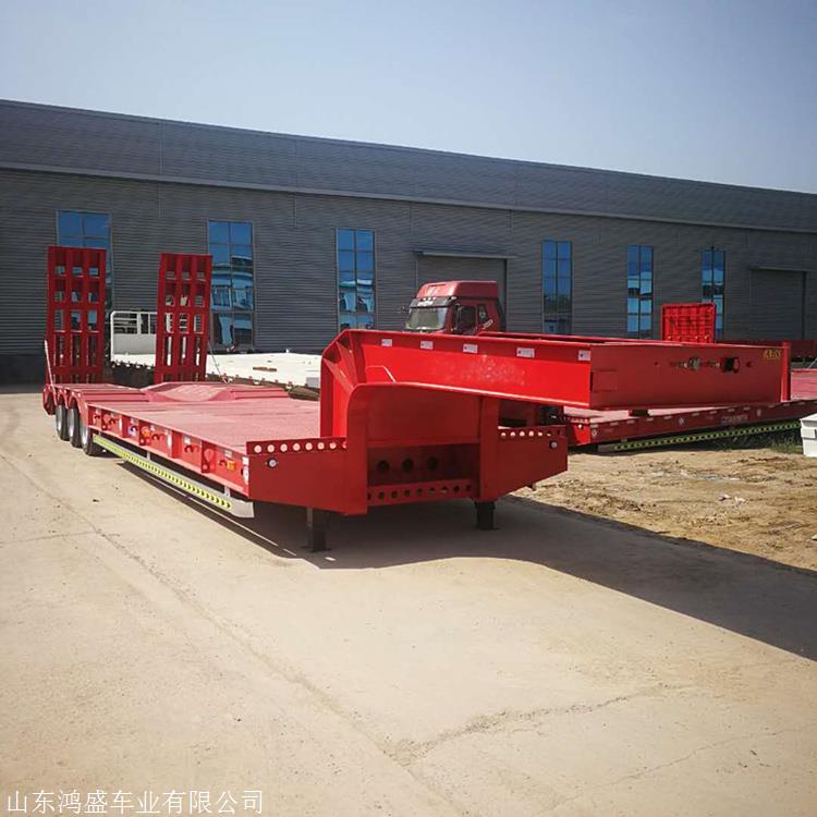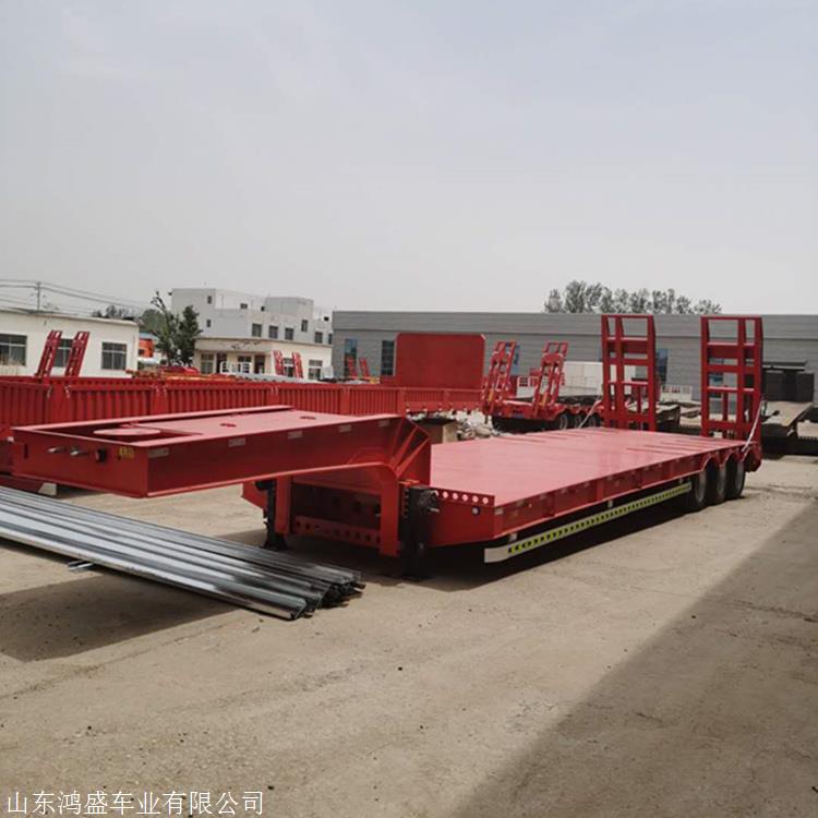 低平板半挂车有平板式,凹梁式,轮胎外漏式和抽拉式结构,其车架为阶梯型,纵梁截面为工字型,具有刚度高,强度高等特点。整车车身采用优质钢材,车架货台主平面低,保证了运输的平稳性,适宜运载各种工程机械,大型设备和钢材等。采用三轴平衡式,双轴平衡式或刚性悬架,,在前后钢板弹簧之间装有质量平衡块,可使前后钢板弹簧等量变化,使前后轴受力均衡等优点。 抽拉式低平板半挂车使用二氧化碳气体保护焊,整车架经喷丸处理,使车辆更美观。精密的生产工艺制造而成,整车结构合理,性能可靠,操作简便,外型美观抽拉式可以根据客户的要求拉长4-45米,满足客户的个性化要求。