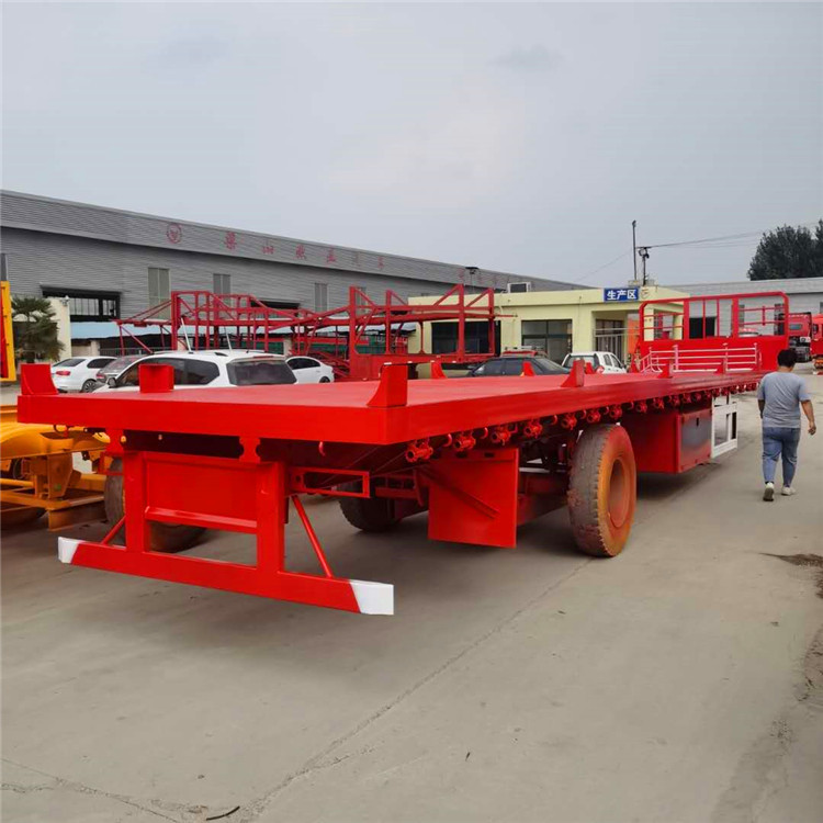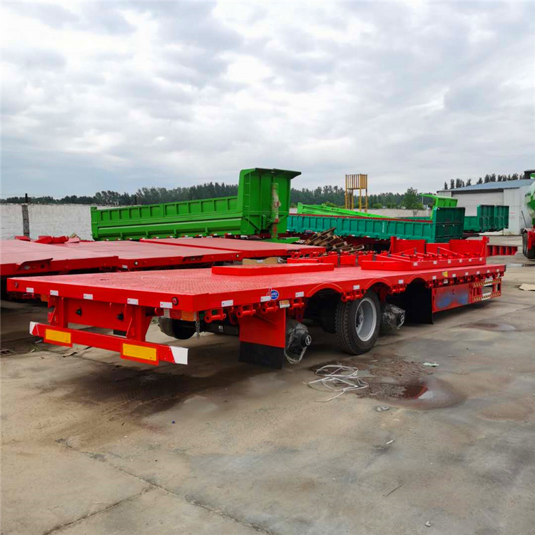 低平板半挂车上装载机械设备时,通常是从半挂车后端装载机械设备,即采用从后轮架上 面移动机械设备或者将车轮移除的方式, 然后再将机械设备固定在半挂车上。低平板式半挂车行走结构使用高强度钢材质,整车自重轻,并保障其抗扭曲、抗震、抗颠簸能力、满足不同的路面承载能力。低平板半挂车采用三轴平衡式、双轴平衡式或钢性悬架,在前后钢板弹簧之间有质量平衡块,可使前后钢板弹簧的挠度等量变化,使前后轴受力均衡等,二氧化碳气体保护焊接;整个车架经喷丸处理,使车辆更美观、坚固耐用。采用车桥穿越大梁,有效降低了载货平台的离地高度,该车增大的通过能力可装载更大直径的物件,是适合运输风电塔筒及大直径货物的理想运输工具。